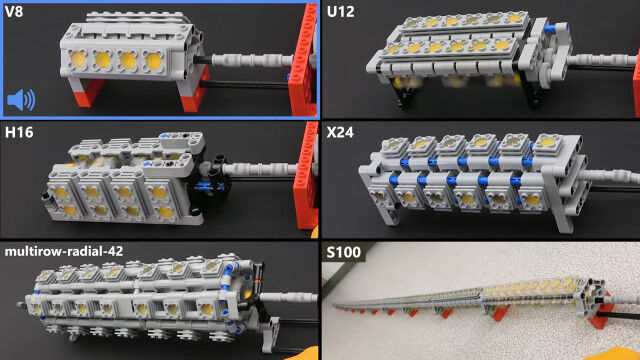 実在するエンジンの仕組みをそれぞれレゴで再現し、モーターで3,000rpmで回転させた映像。