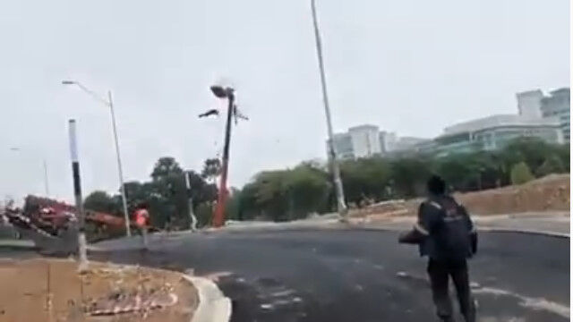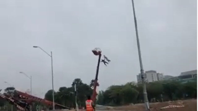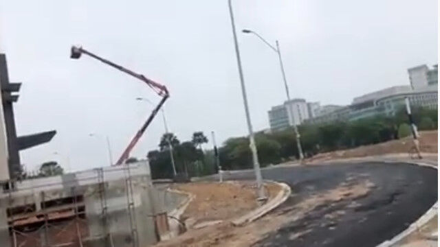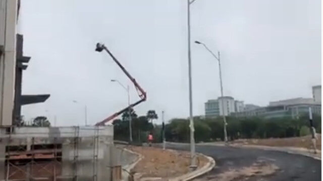 チェリーピッカーと呼ばれる種類の高所作業車が、最大積載量を超えてアームを伸ばしてしまったために転倒した事故。