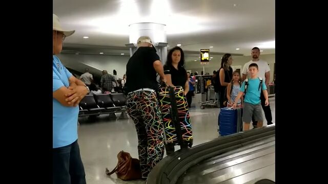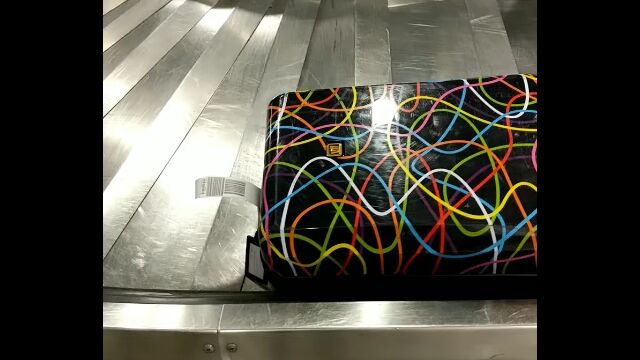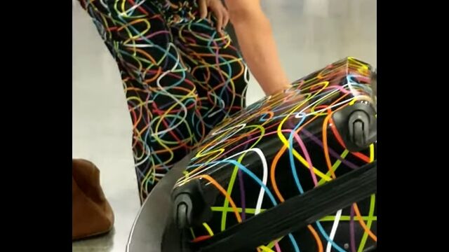 ラスベガスの空港で手荷物を待っていた撮影者さんは、クレイジーなデザインのズボンを履いた男性に気付き、その後に同じデザインのバッグが流れてきたため、思わずスマホを取り出して撮影。