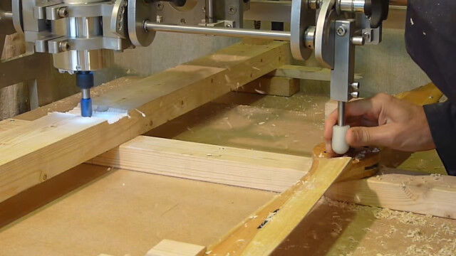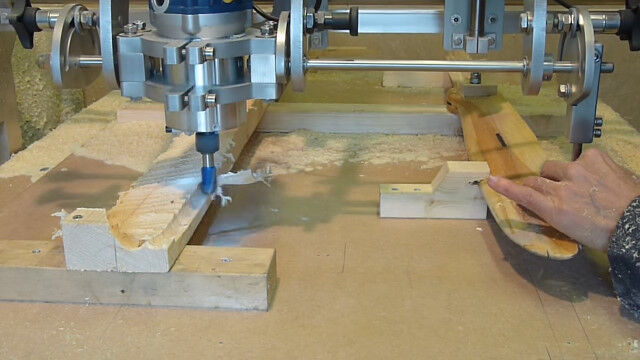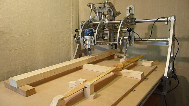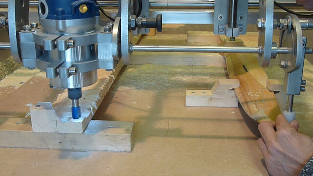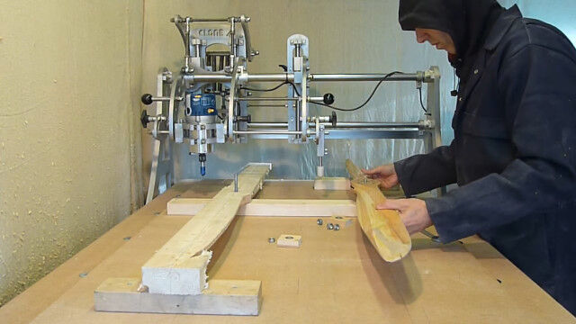 立体物のコピーを作る複製機。破損したプロペラの代わりに、同じ形を木材から削り出す様子