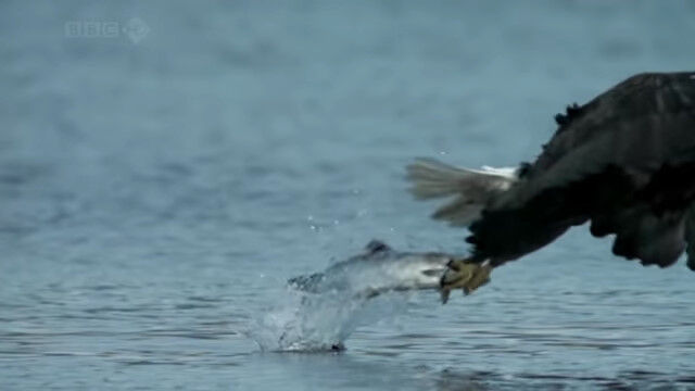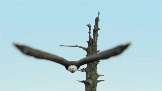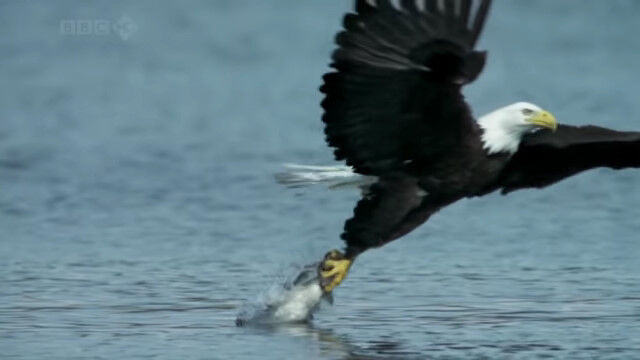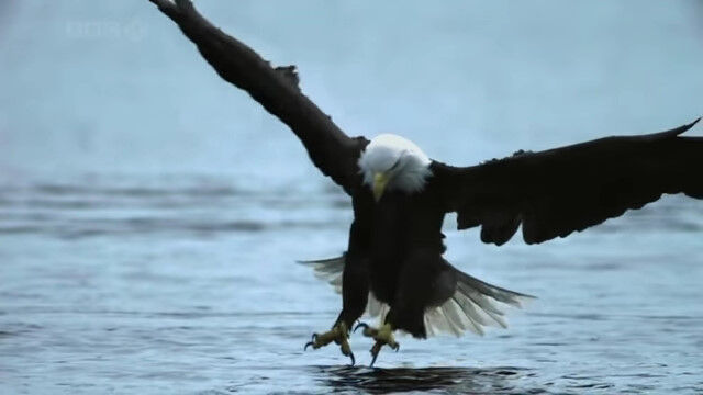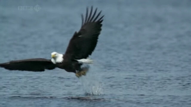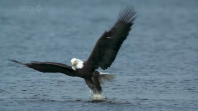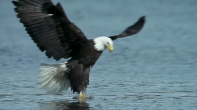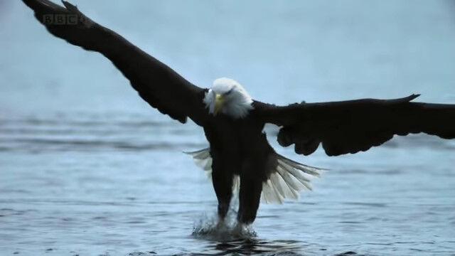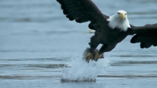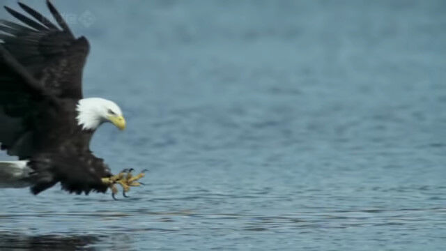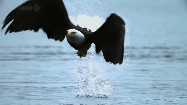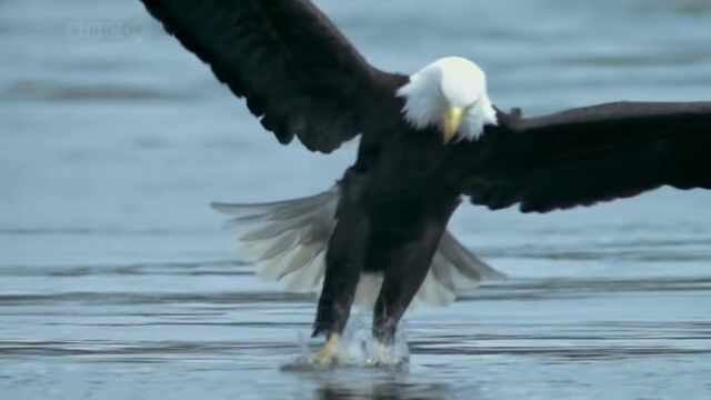 水面スレスレを低空飛行し、すれ違いざまに水中の鮭を捕らえるハクトウワシのスローモーション映像。