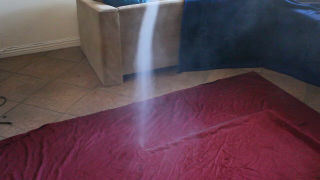あとは天井に設置されたシーリングファンを逆回転させ、空気を吸い上げるようにすれば、屋内トルネードの出来上がり。