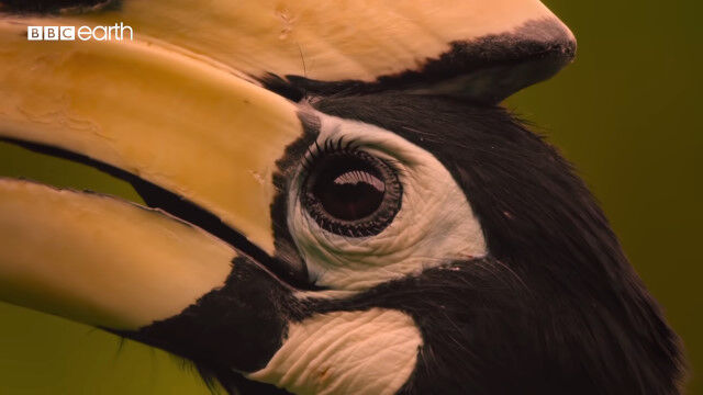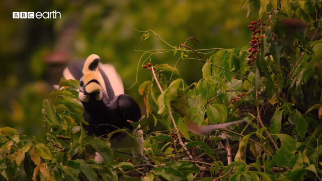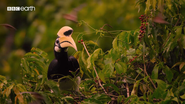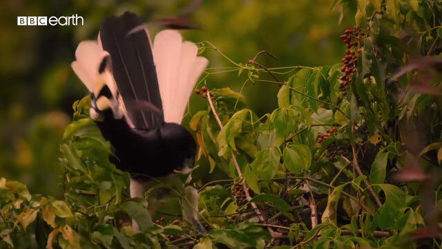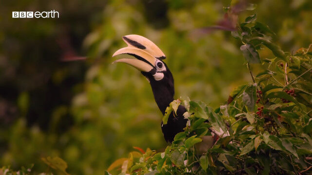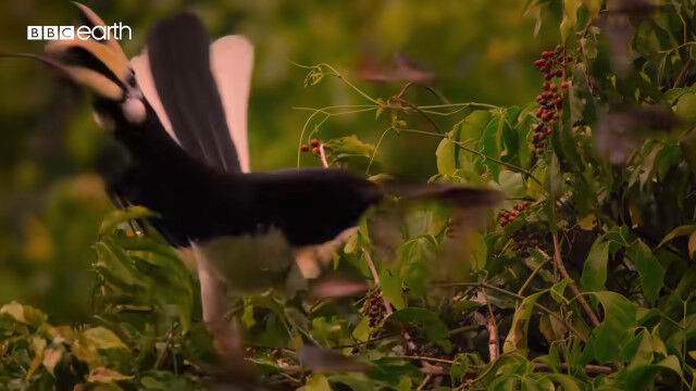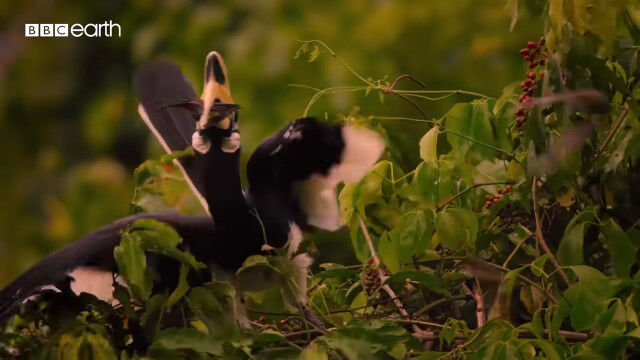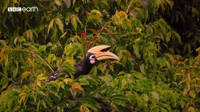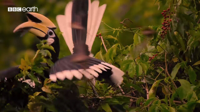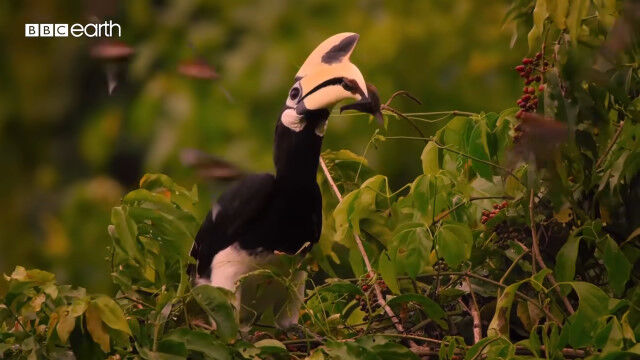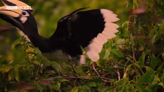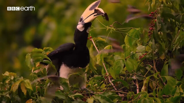 大きくて特徴的な形のクチバシを持つカササギサイチョウ(Oriental pied hornbill)の狩りの様子。