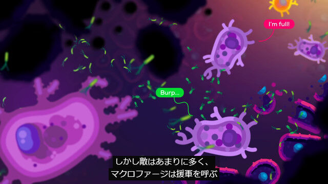 大きいサイズで100個程度の細菌を食べるマクロファージ、細菌を殺すことに特化した好中球、細菌に穴を開けて攻撃する補体タンパク質、細菌のサンプルを持ち帰って司令官に伝える樹状細胞、サンプルに該当する武器ごと分裂するヘルパーT細胞や、抗体の工場であるB細胞など。