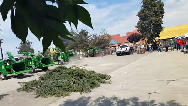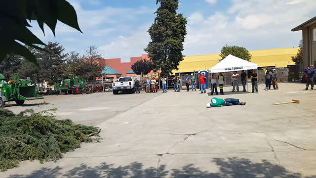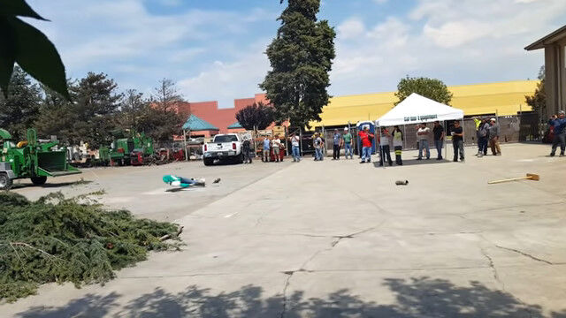 稼働中の木材粉砕機に、木登り用のロープの端が入ってしまった場合、どうなってしまうのかを等身大の人形で再現。