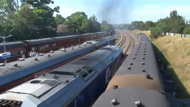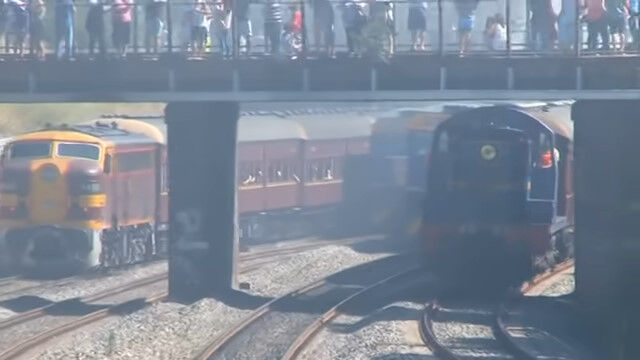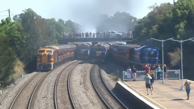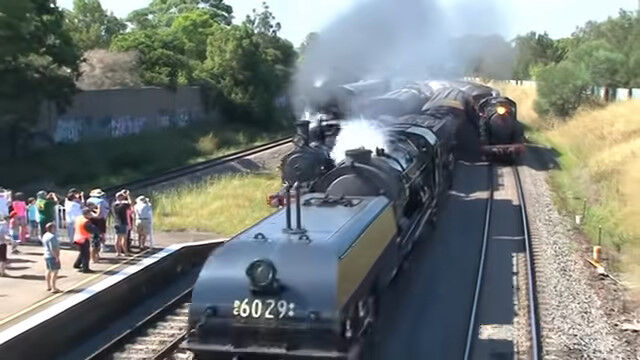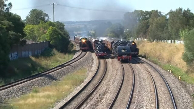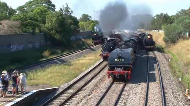 2016年にオーストラリアのビクトリアストリート駅にて、スチームフェストというイベントの一環として行われた、蒸気機関車4台の並走。