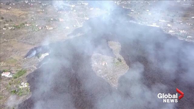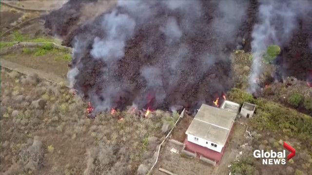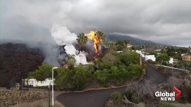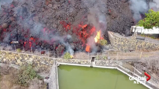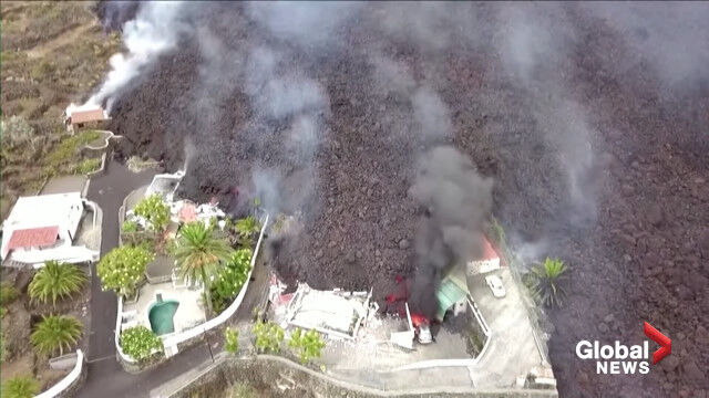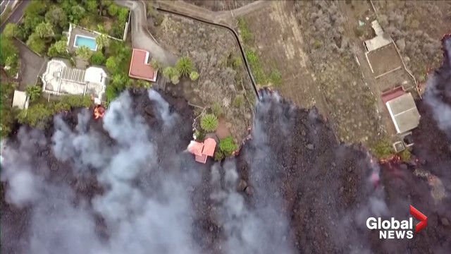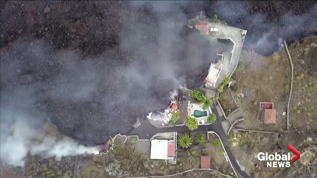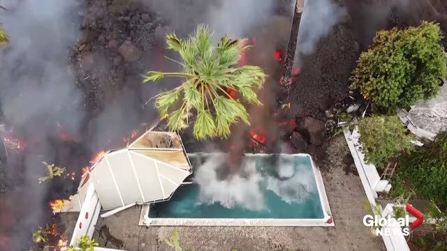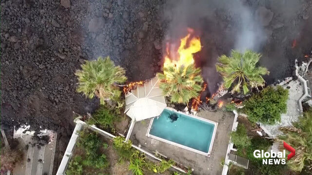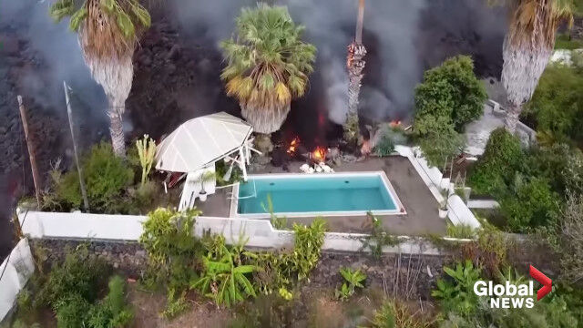 La Palma volcano: Drone video shows black lava swallowing pool, homes on its way to coast