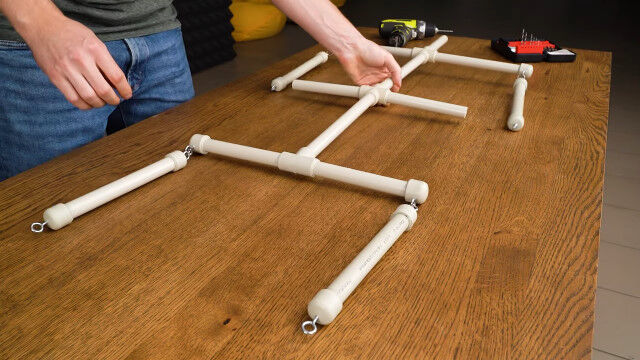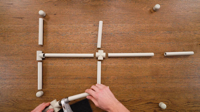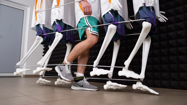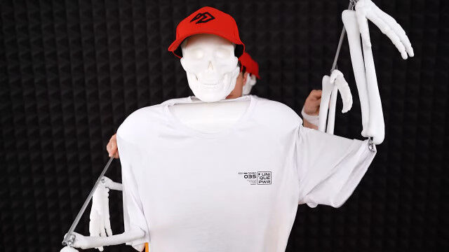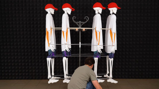 PVCパイプで作ったボディーに頭蓋骨と手足の骨を付け、同じ衣装で揃えれば完成。