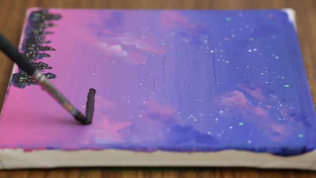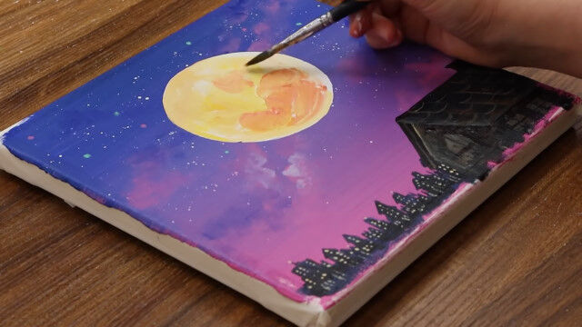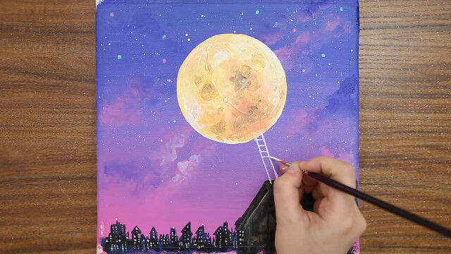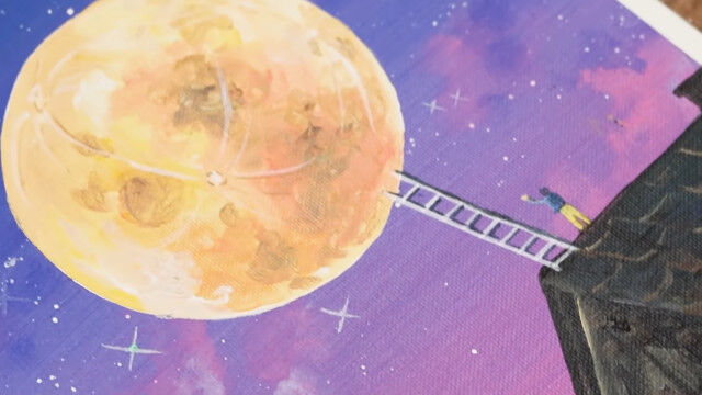 満月にのぼろうとする少年を描いたアクリル絵画の制作風景。