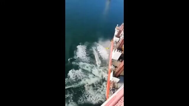 3枚のブレードと中心のハブをまとめて運んでいたものが、誤って海へと落下してしまう。