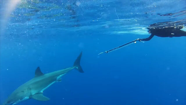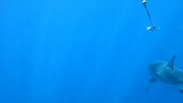 - ホホジロザメと一緒に泳ぎ、水中銃で音響タグを撃ち込むダイバー $ArticleTagsLoop$>