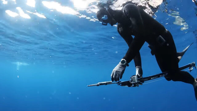 サメ学者によるホホジロザメの回遊行動の研究のため、11個の音響タグをホホジロザメの背中に撃ち込むダイバー。