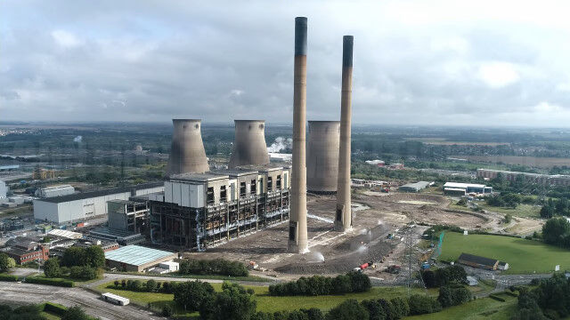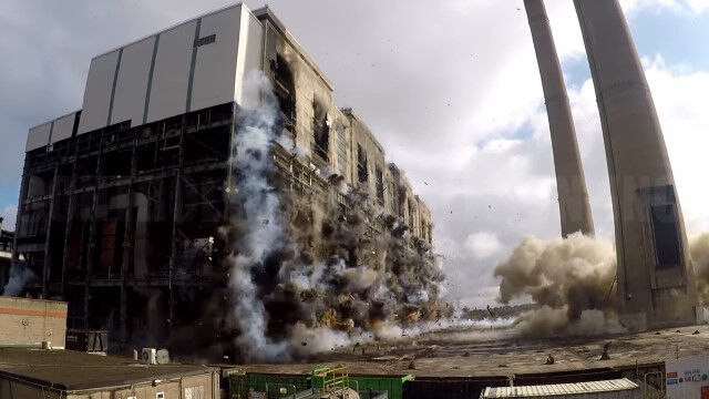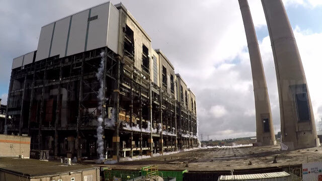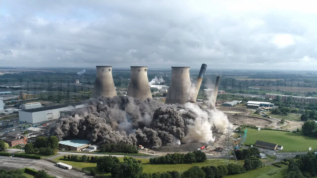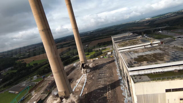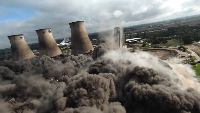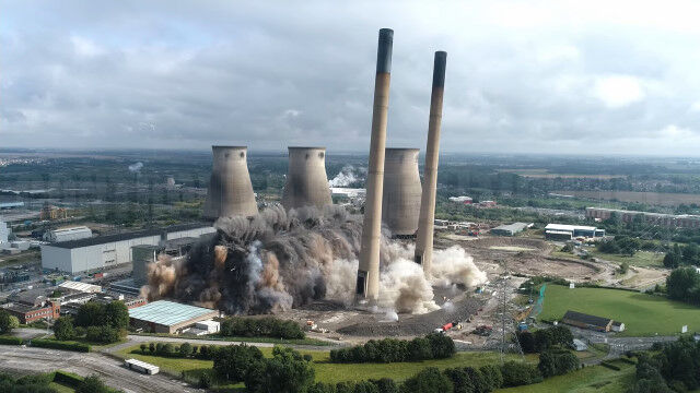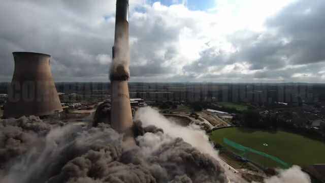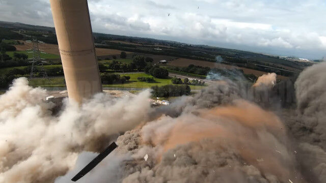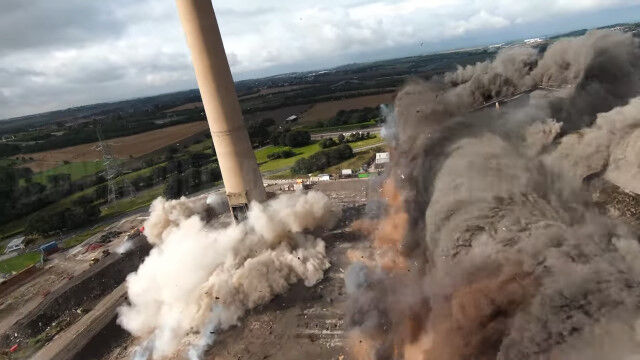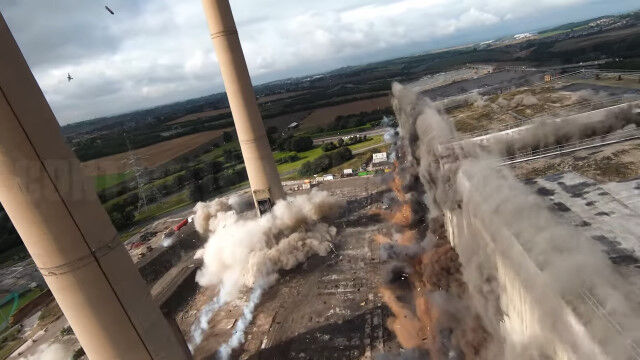 イングランドにある発電所の爆破解体を、ドローンで至近距離から撮影