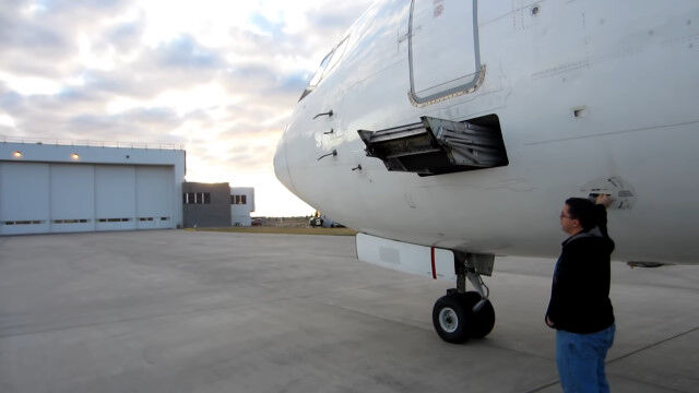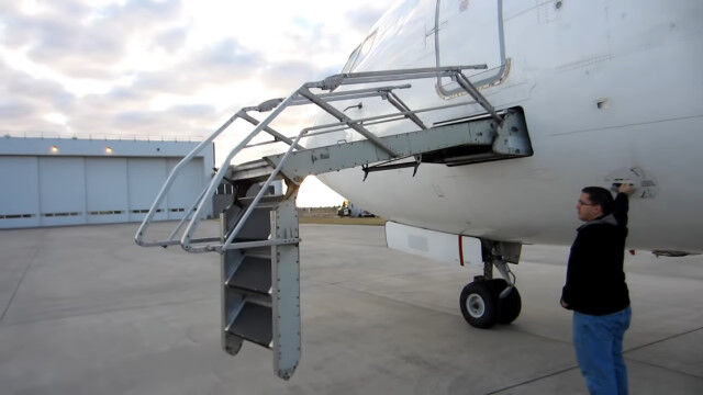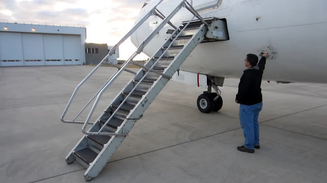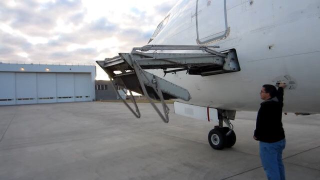 飛行機に格納された階段、エアステアを展開する様子