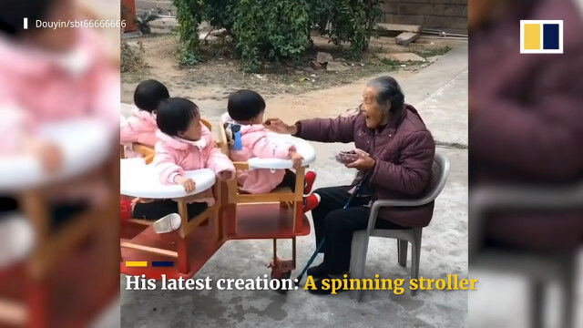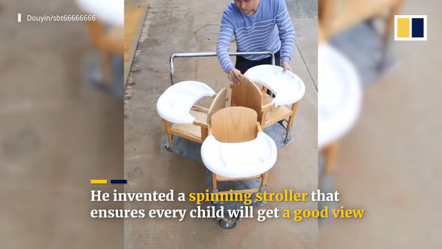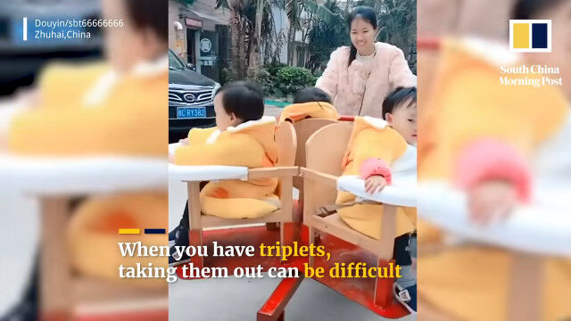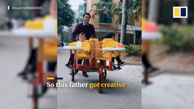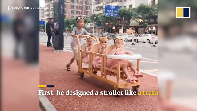 三つ子の幼い娘たちを連れて歩くため、ベビーカーを自作した中国、珠海市(しゅかいし)在住のパパ。