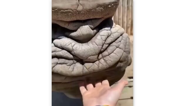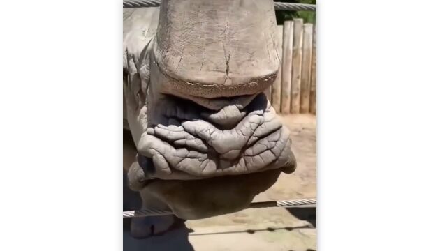サイの口元をアップで映しつつ、オレンジを与えている映像。