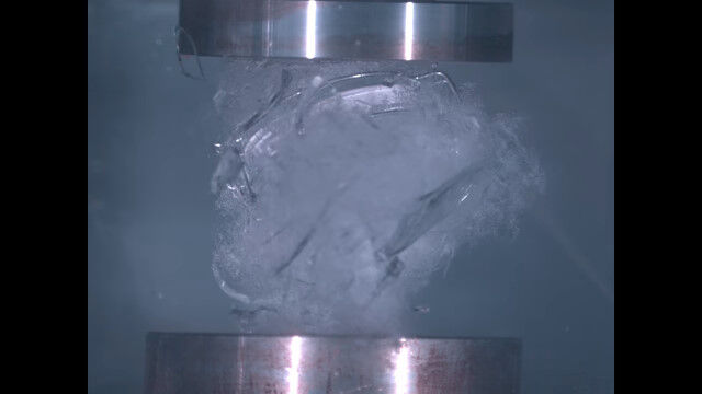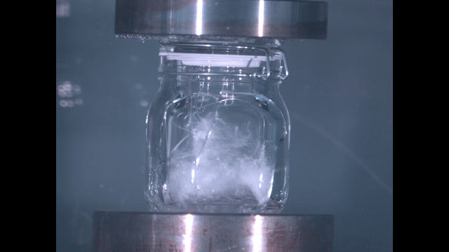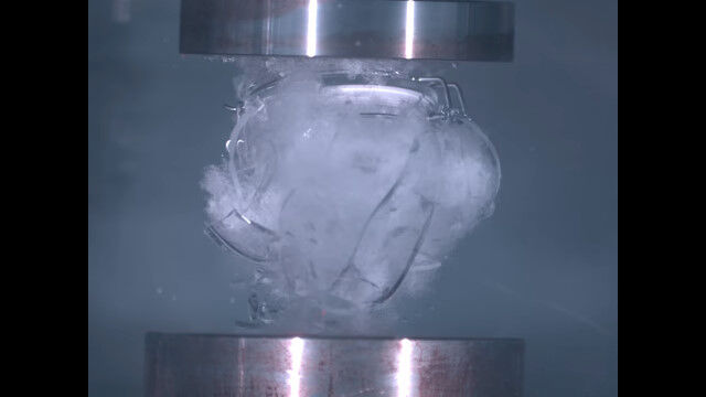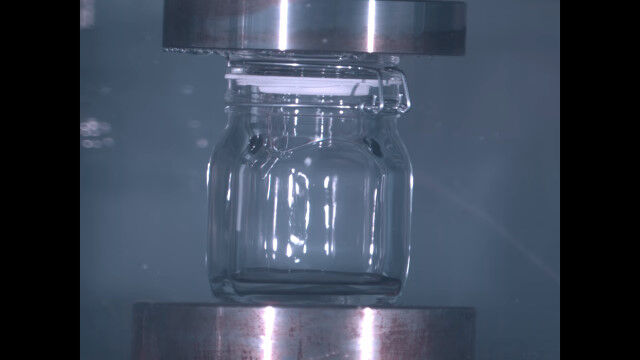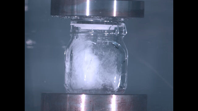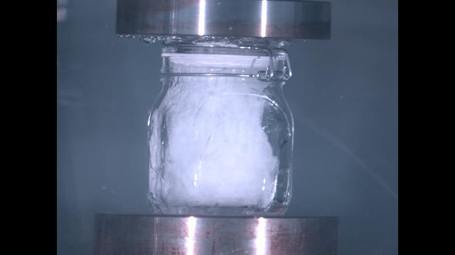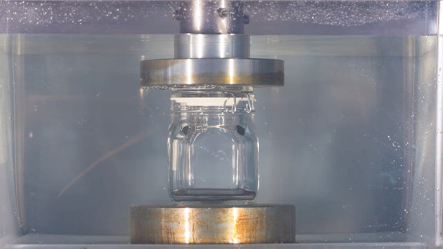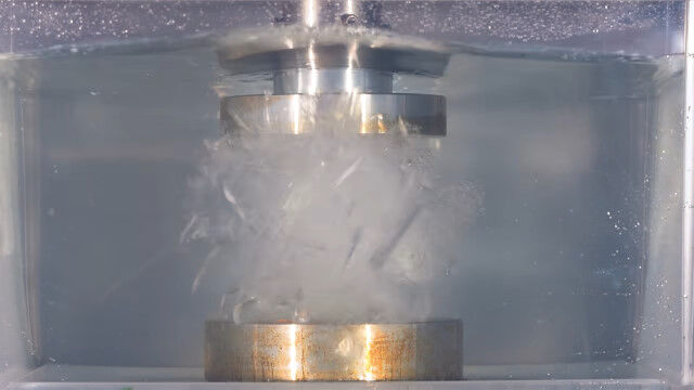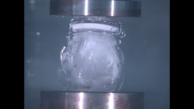 真空のガラスボトルを水中で割るとどうなる?油圧プレスを使った実験映像