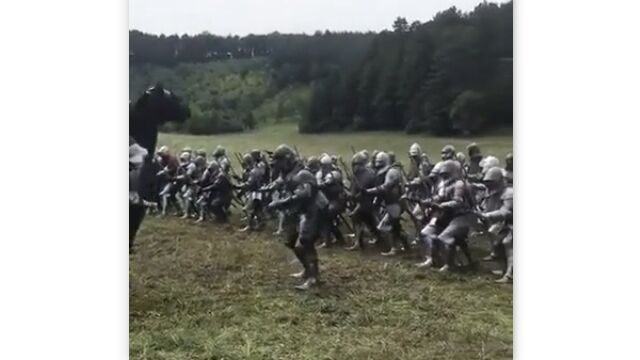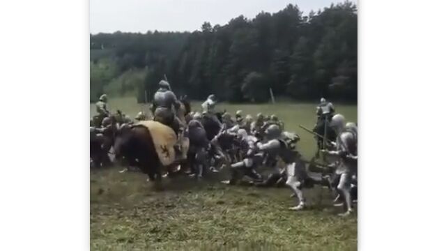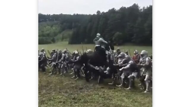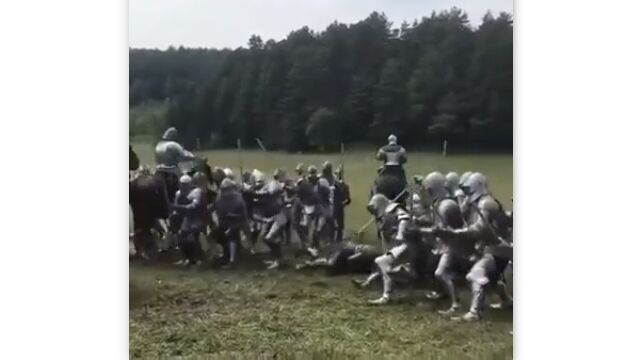 プレートメイルに身を包んだ歩兵が隊列を組んで立ち向かっても、数騎の騎兵によるチャージはどうしようもないのだとわからされる再現映像。