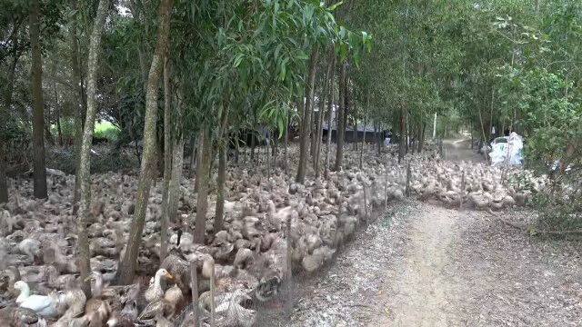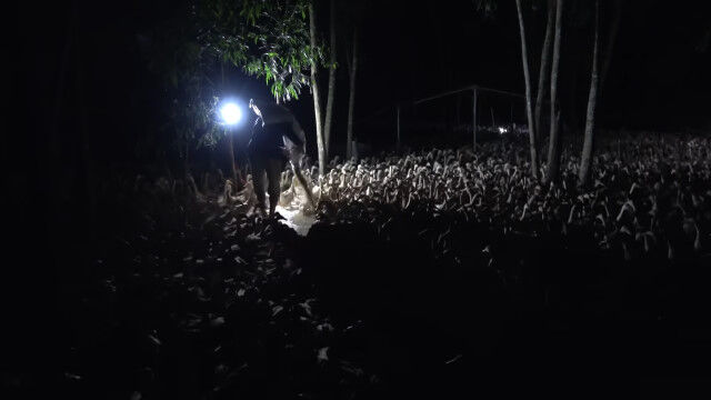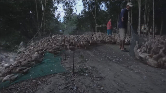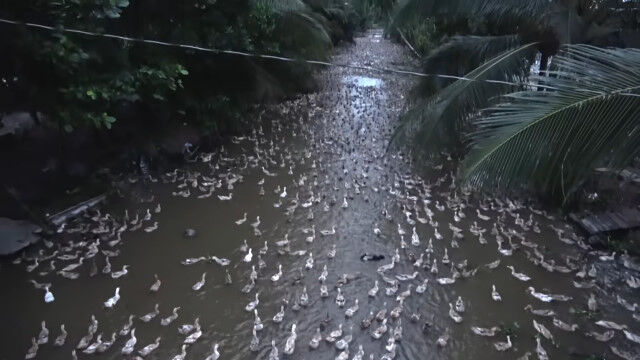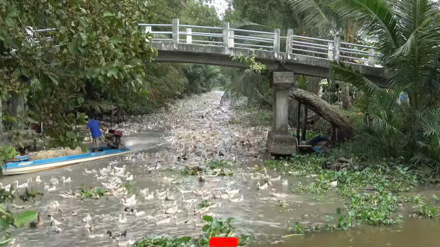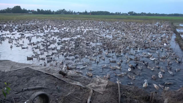 ベトナム、キエンザン省にある、数千羽のアヒルを飼育しているアヒル農家のお仕事風景。