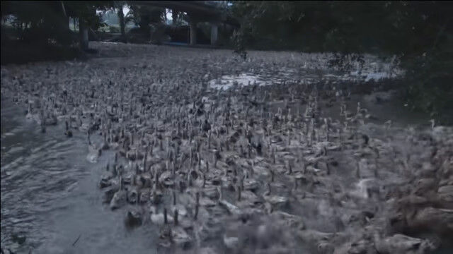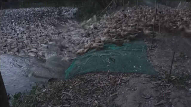 数え切れないアヒルの大行進に、見渡す限りをアヒルが埋め尽くす光景。