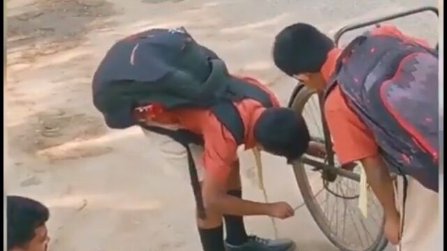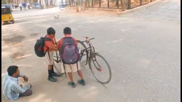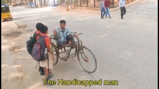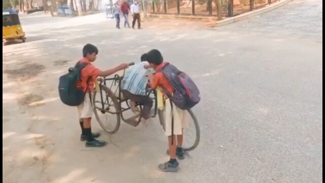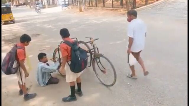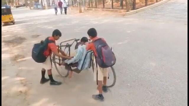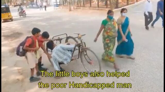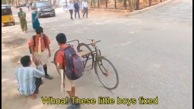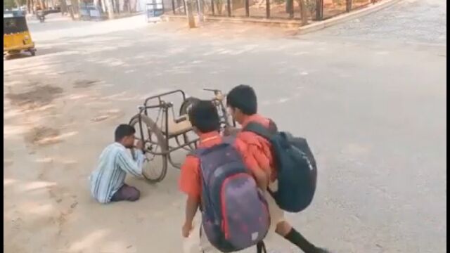 インドにて、手漕ぎ三輪自転車が壊れて困っている男性を、通りかかった男の子たちが助ける