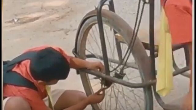 #インドにて、手漕ぎ三輪自転車が壊れて困っている男性を、通りかかった�