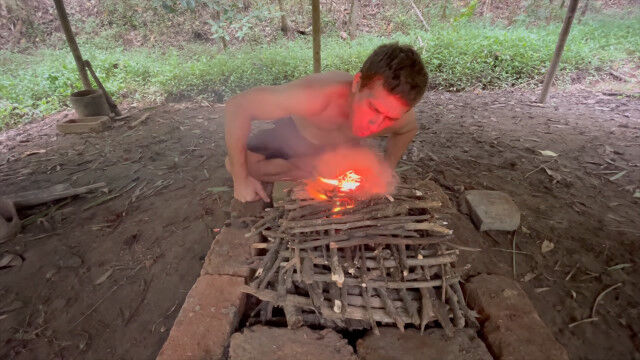 樹皮を編んで投石器を自作、投石訓練を繰り返す原始生活お兄さん