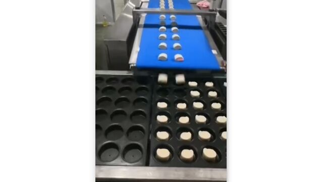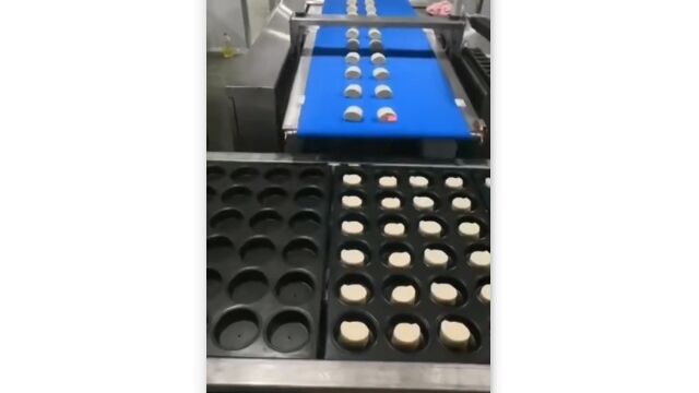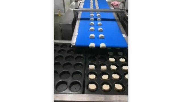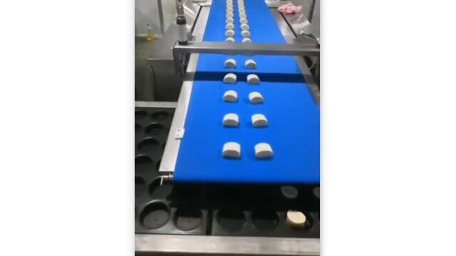 黒い型の中に、ほどよいサイズにカットした生地のようなものを次々と落とし入れていく、食品工場のベルトコンベア。