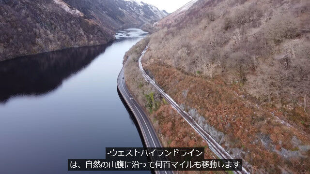 スコットランドの鉄道、ウエスト・ハイランド線は、山腹に沿って敷かれた路線。