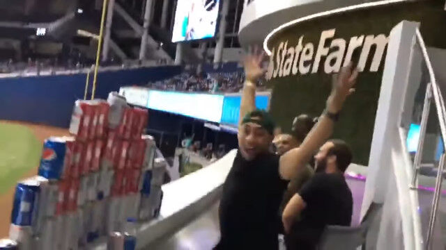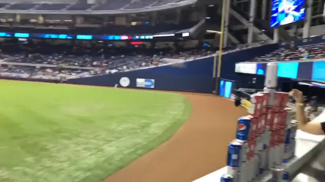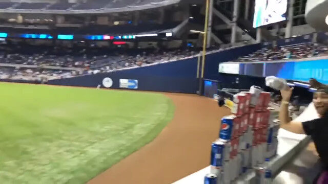マイアミ・マーリンズがワシントン・ナショナルズと対戦したメジャーリーグの試合中、ビールの空き缶をピラミッド状に積み上げた客席のファンたち。