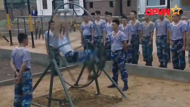 中に入った自分ごと回転する遊具のようなものや、シーソーブランコのようなものを使い、バランス感覚を鍛えるベトナムの海兵隊。