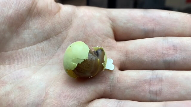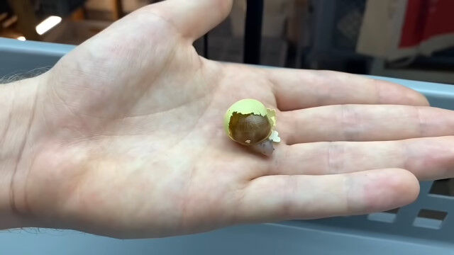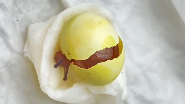 孵化した直後、自分の卵の殻をモシャモシャ食べる巨大カタツムリ