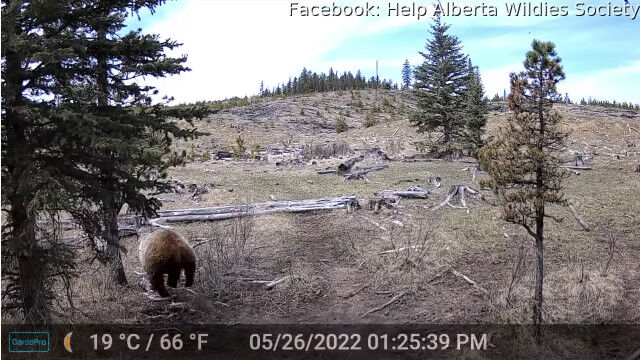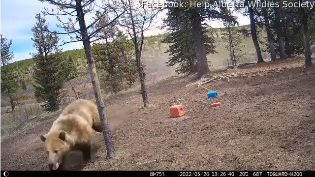 5月26日、カナダ、アルバータ州で撮影された、野生馬の群れを追いかけるハイイログマ。