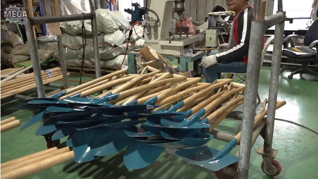 持ち手が木製のシャベルを作る、シャベル工場の作業風景