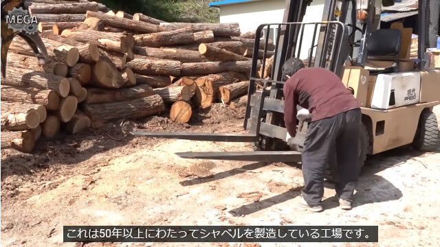 持ち手が木製のシャベルがどのように作られ、完成していくのかをまとめた映像。