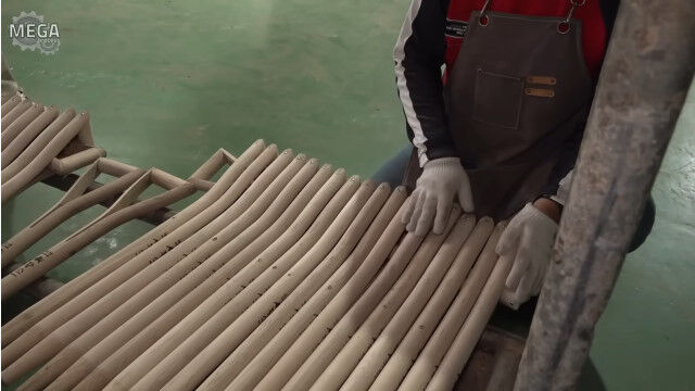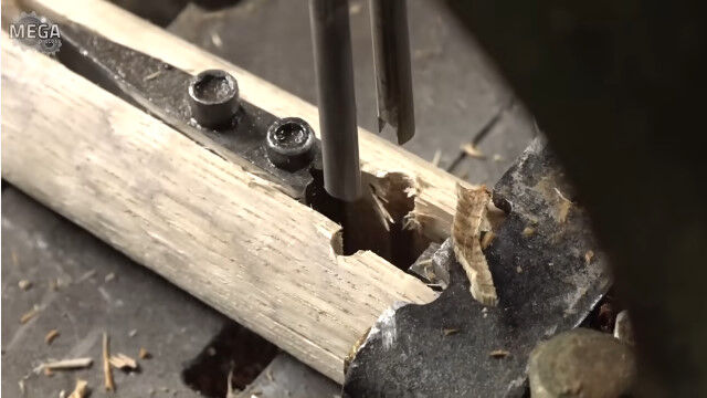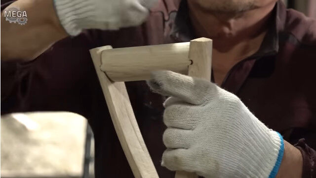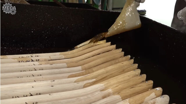 樫の木を棒状に加工して、持ち手部分に切れ目を入れて蒸し、金型で固定して横棒と組み合わせる。