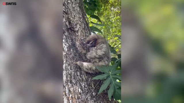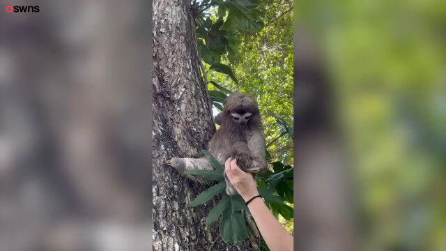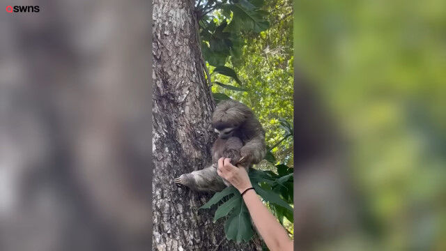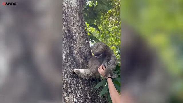 大きな鉤爪でギュッとホールド。猫大好きなナマケモノ