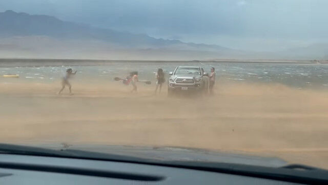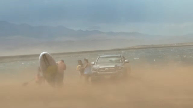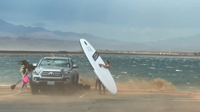 激しい風にパドルボードを飛ばされないように耐える男、一部始終を撮影�