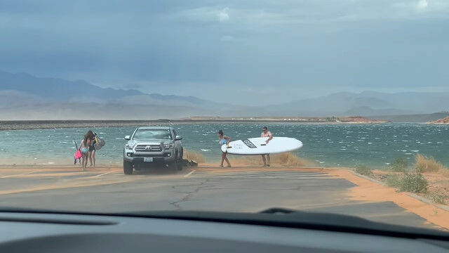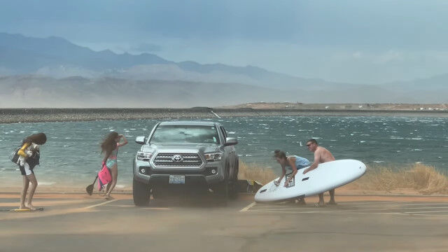 強風が吹きはじめたため、パドルボードを中止して車に積み込もうとした男性とその家族。