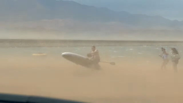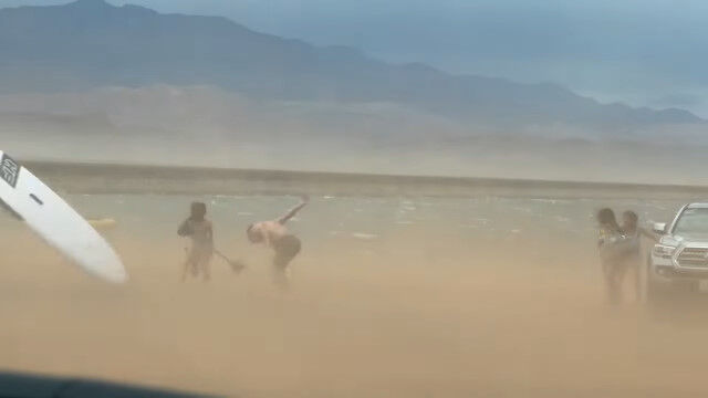 激しい風にパドルボードを飛ばされないように耐える男、一部始終を撮影される