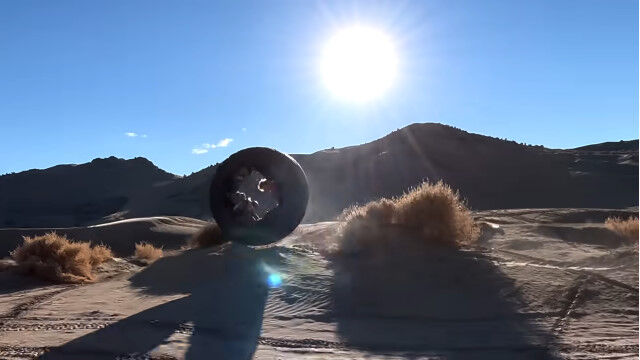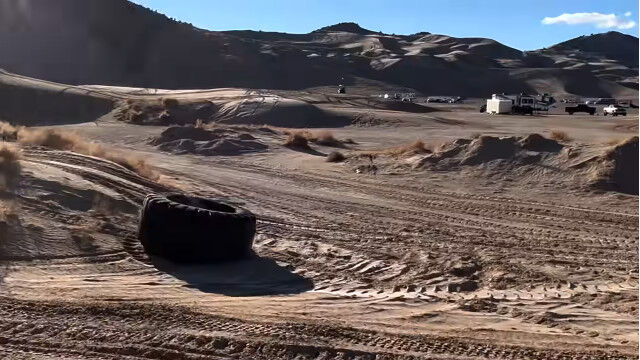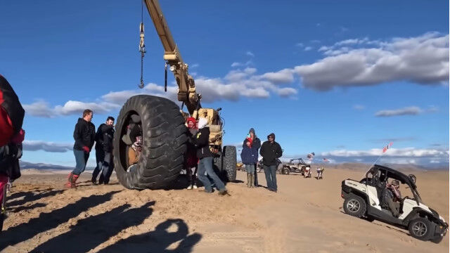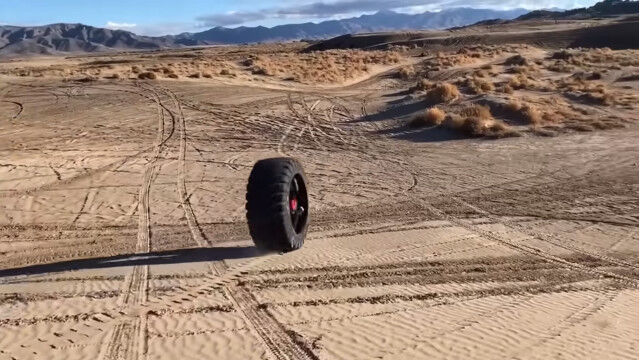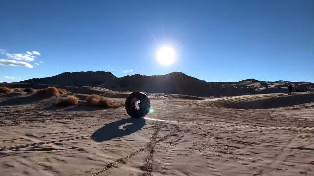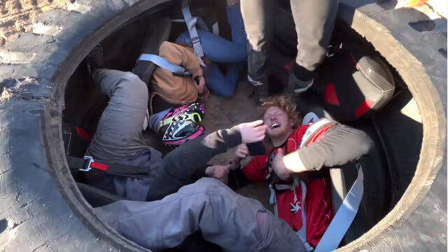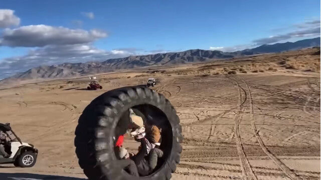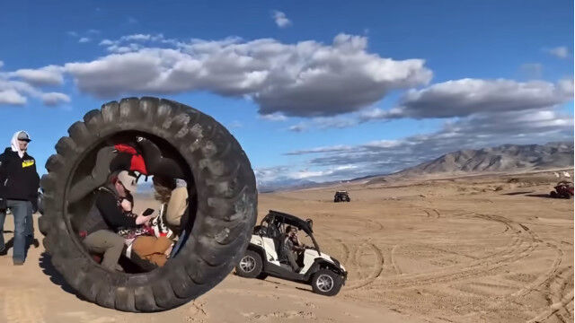 巨大タイヤに4人入り、荒野で転がすという豪快な遊び