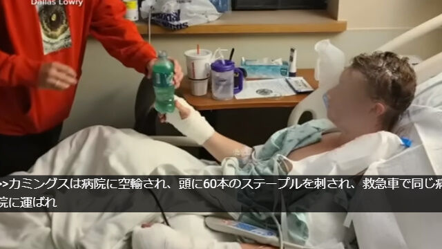 重傷を負ったカミングスさんは病院に運ばれた後、頭部に60本のホチキスを打ち、複雑骨折した腕を治療。