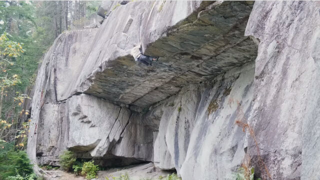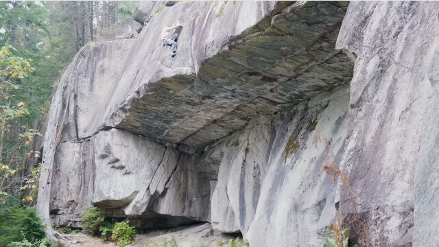 カナダ、ブリティッシュコロンビア州のスモーク・ブラフス・パークにある、ゾンビルーフと呼ばれるクライミングスポットを登る、クライマーのガス・ライアンさん。