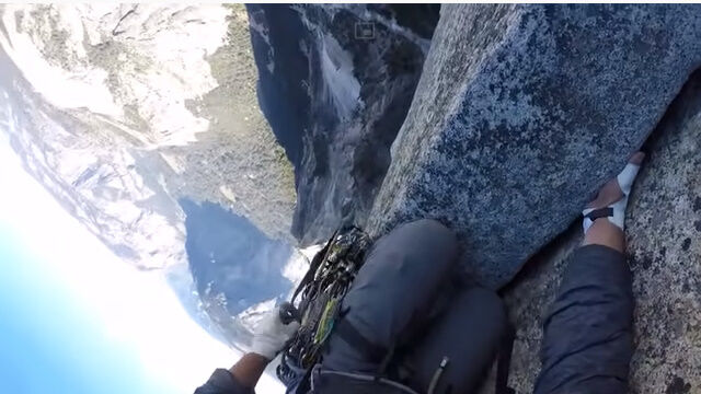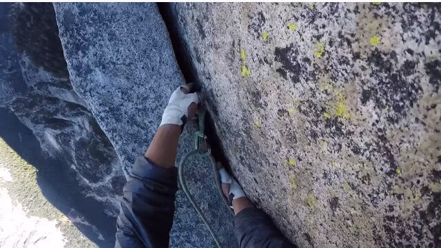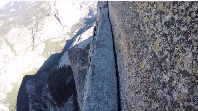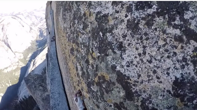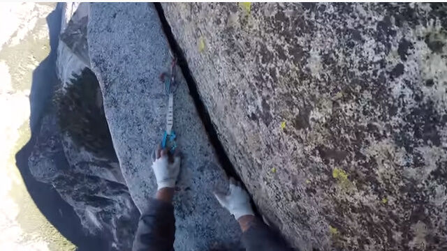 1人立つのが精一杯という幅の岩場を進む、ロッククライミングの主観映像