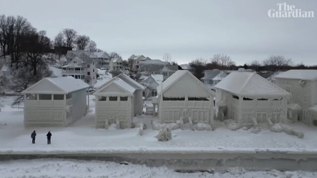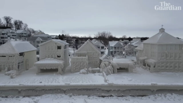エリー湖の水が吹き上げられ、湖畔の家に水しぶきがかかり、厳しい寒さで凍りついてしまったとのこと。