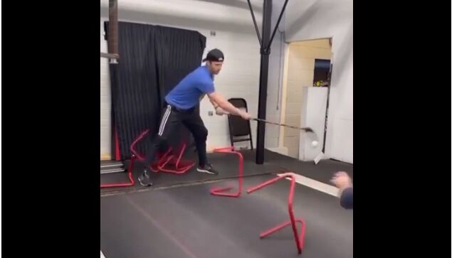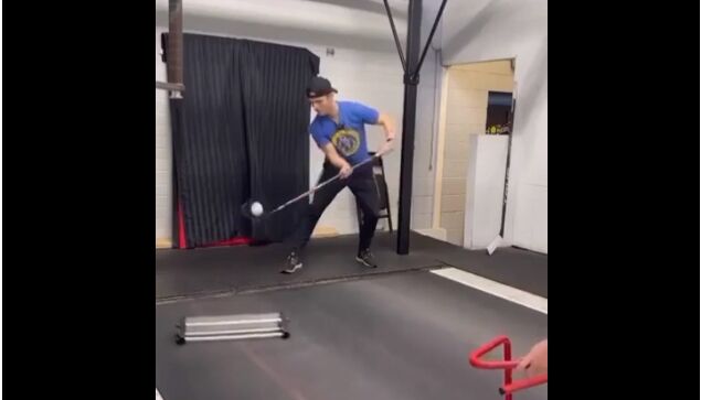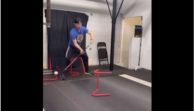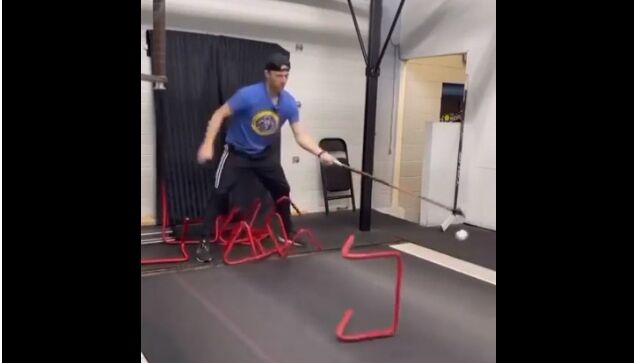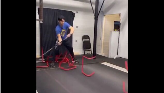 大きなルームランナーのような設備を使い、ホッケースティックの扱い方を鍛えるトレーニング。