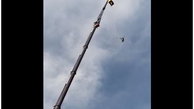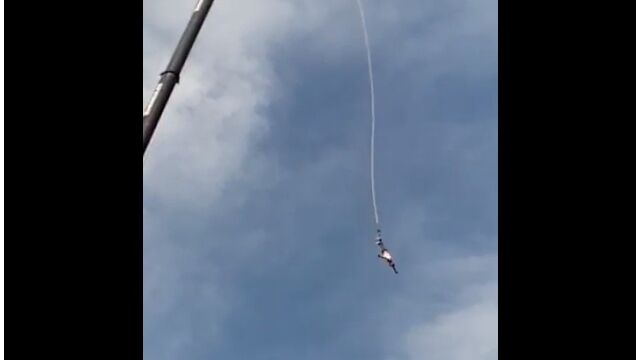 大型クレーンで高所に吊るされた状態から落とされるバンジージャンプで、落下中にゴム紐が外れてしまうアクシデント。