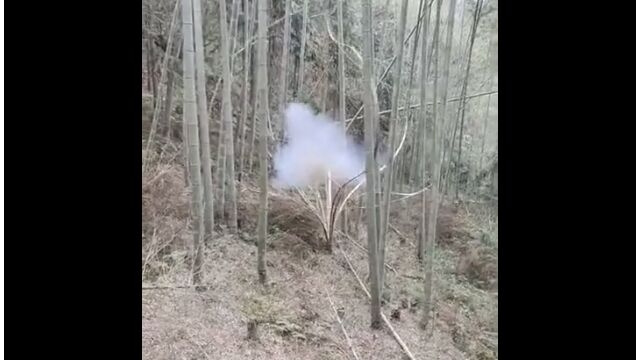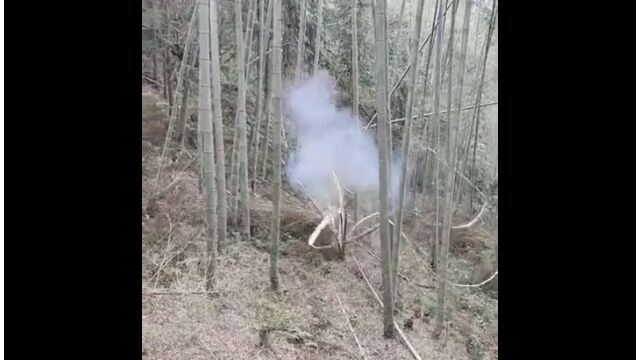 竹の一部に小さな穴を開け、強力な爆竹に火をつけて投入。