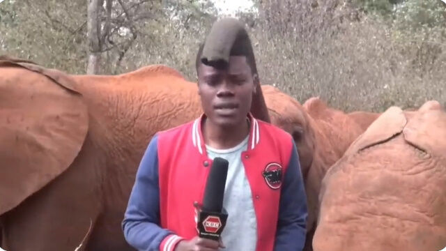真剣に話している最中、好奇心旺盛な赤ちゃんゾウさんが、長い鼻でレポーターを探り出す。