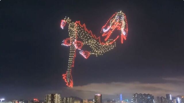 巨大な龍が夜空を舞い飛ぶ、中国のドローンショー